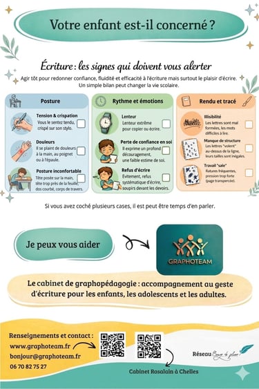 Mon rôle de graphopédagogue consiste à chercher ce qui bloque le jeune (sa posture, sa tenue de crayon, un mauvais sens de tracé des lettres, un manque de fluidité, de mauvaises stratégies de copies…) et à trouver comment l’aider.