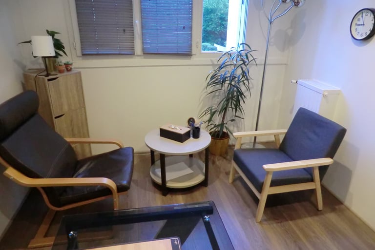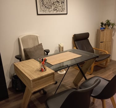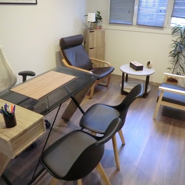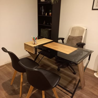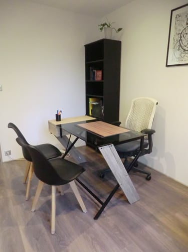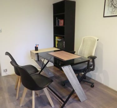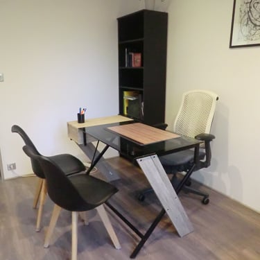 Équipé pour le face à face : Bureau, chaises, fauteuils, table basse et rangement.