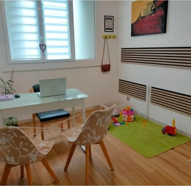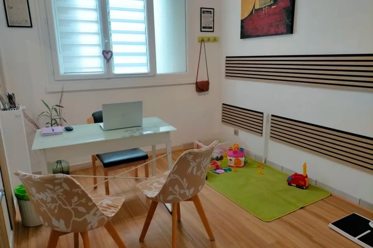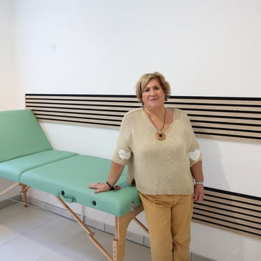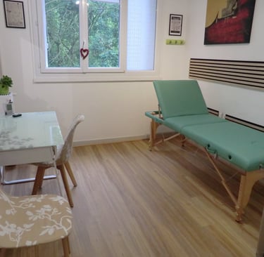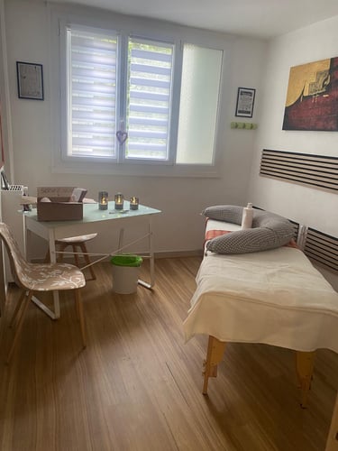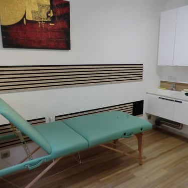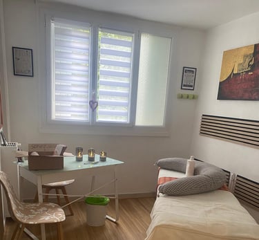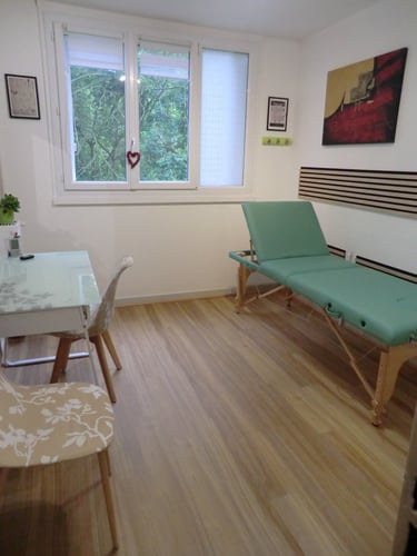 Sont mis à disposition : table de massage pliante avec accessoires et tabouret, tapis enfant, lumières tamisées.