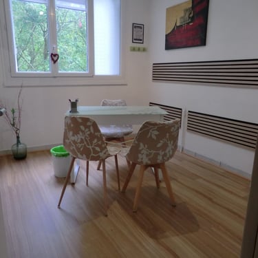 Équipé de façon polyvalente : bureau avec 3 chaises, meuble lavabo avec rangement.