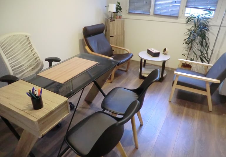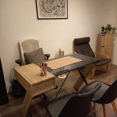 Bureau avec une fenêtre, , un bureau et ses chaises, 2 fauteuils et une table basse.