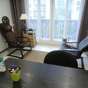 Bureau avec portes fenêtre & balcon, un bureau et ses chaises, 2 fauteuils et une table basse.